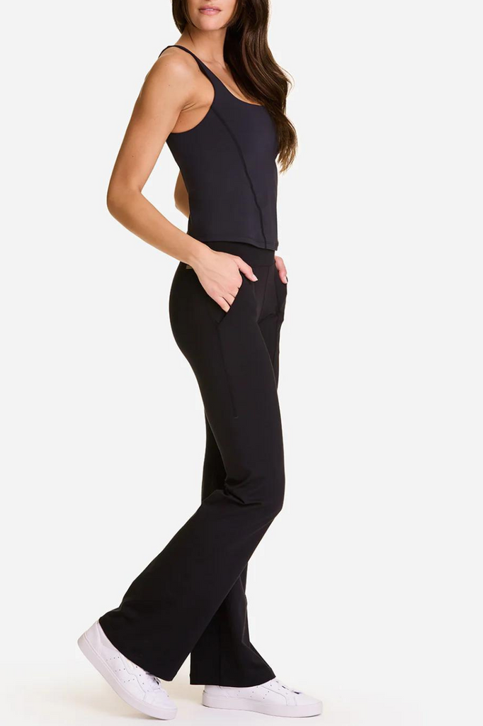 A trendy, basic flare pant taken up a notch or two! Featuring front pockets, slimming seam details, and an effortless pairing with Alala's Muse Shelf Tank.