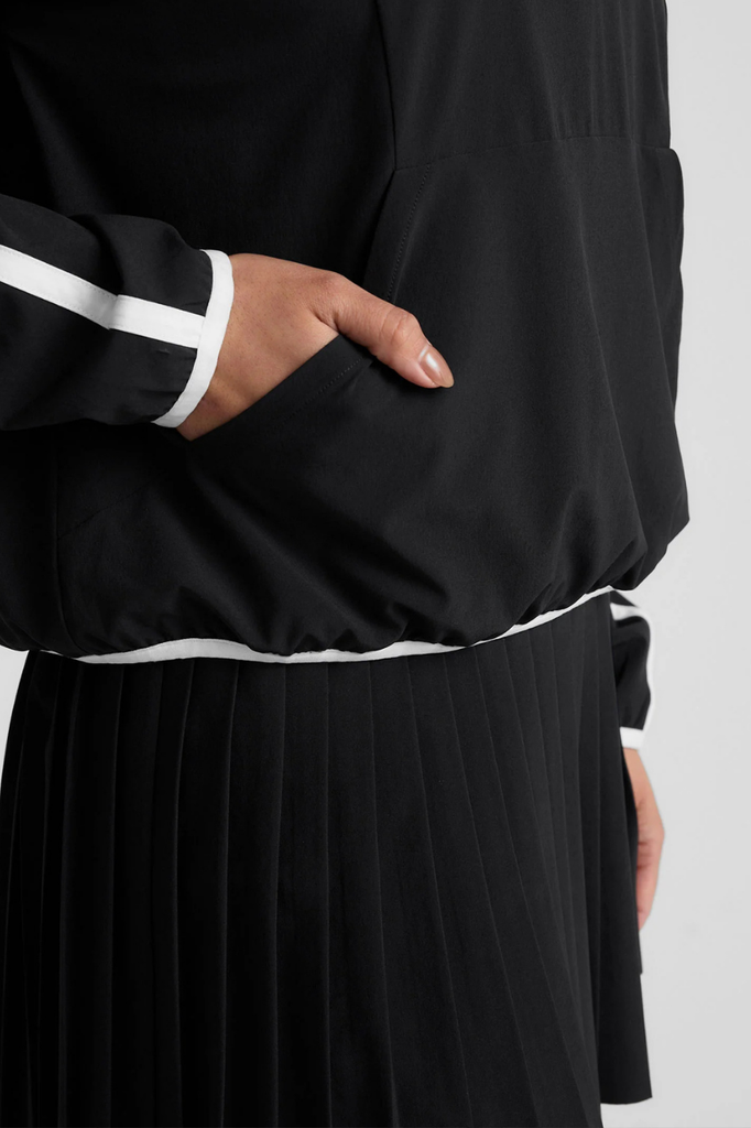 A half zip closure, kangaroo pocket, collar, and color block piping details adds an athletic look and purpose to this stretchy, lightweight pullover by Beyond Yoga. Easy to layer and wear! Pair with The Course Short for a cute little set!