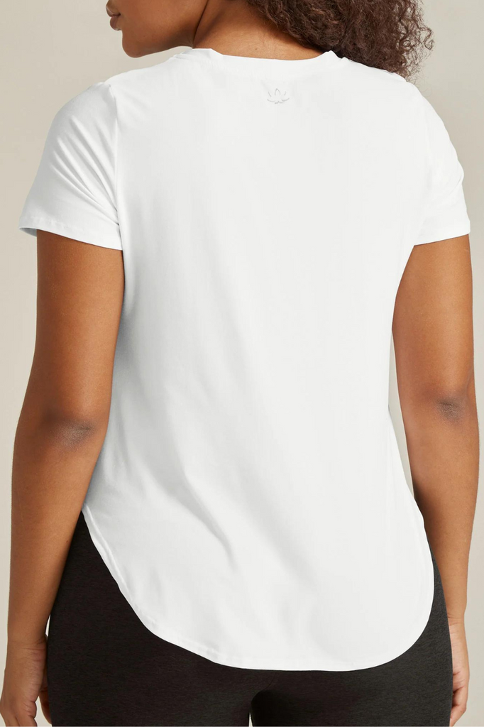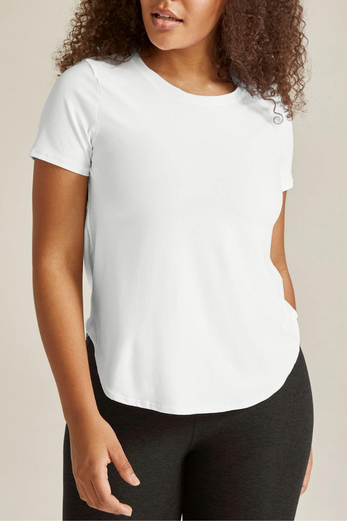 Beyond Yoga's relaxed fit short sleeve tee that features a low hip length. We love this basic top that can be dressed up or down!