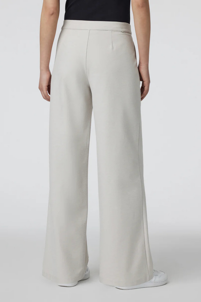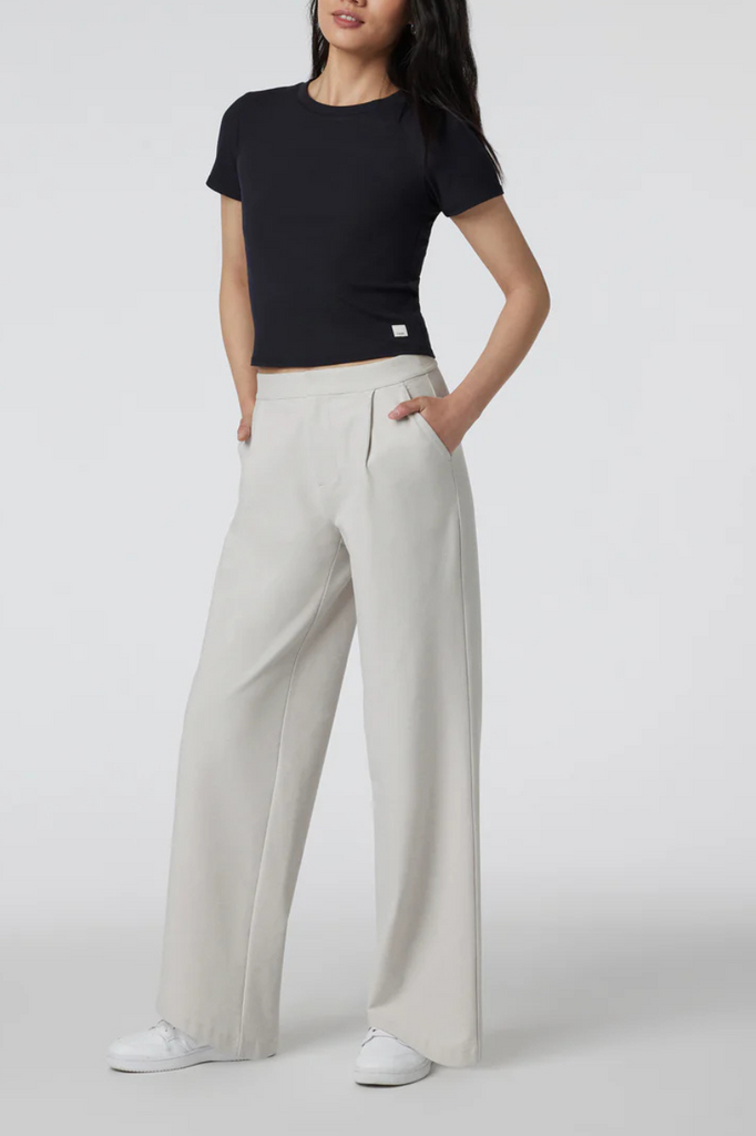 Vuori's Elevation Trouser is a high waisted wide leg pant that provides full support, belt loops, and offers a relaxed fit throughout the leg.