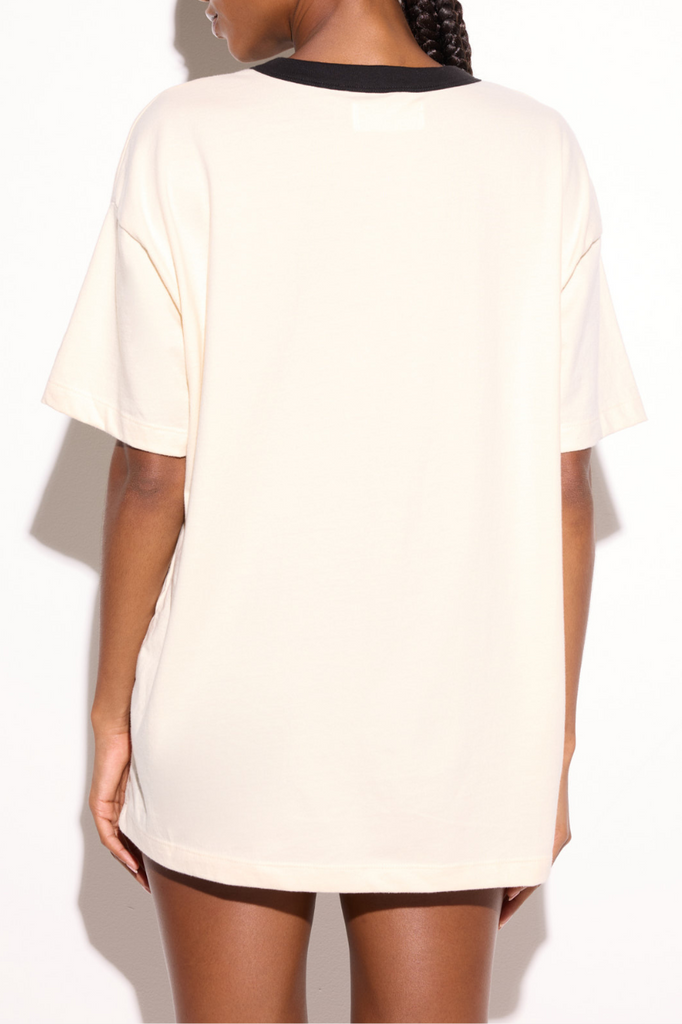 An oversized boyfriend t-shirt featuring a front graphic, 100% cotton fabric, and a black color block neck hem. We love this one!