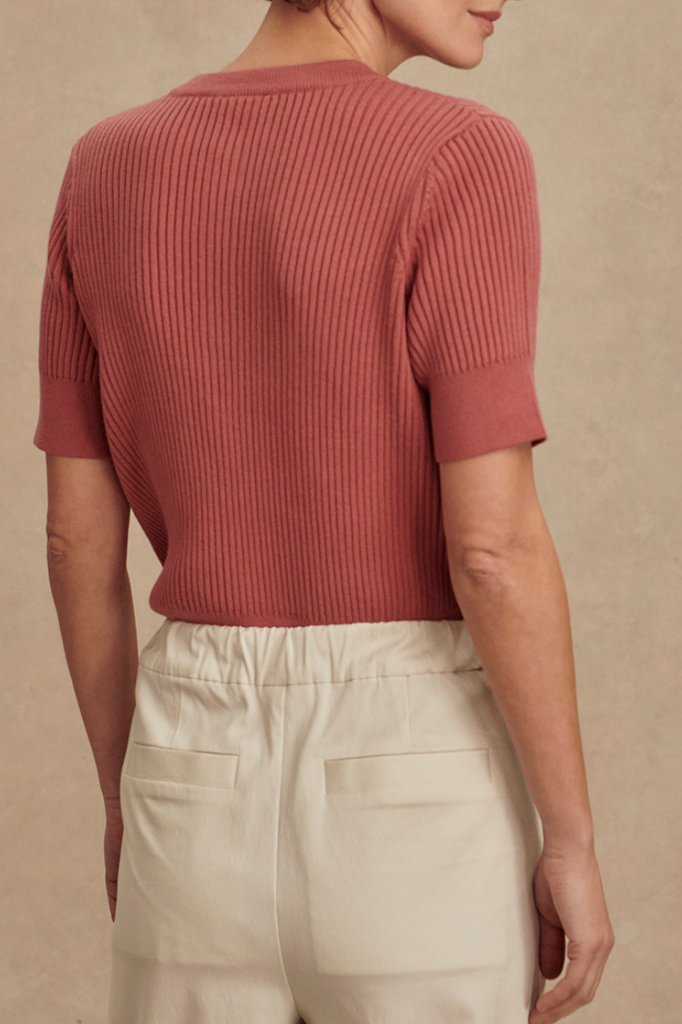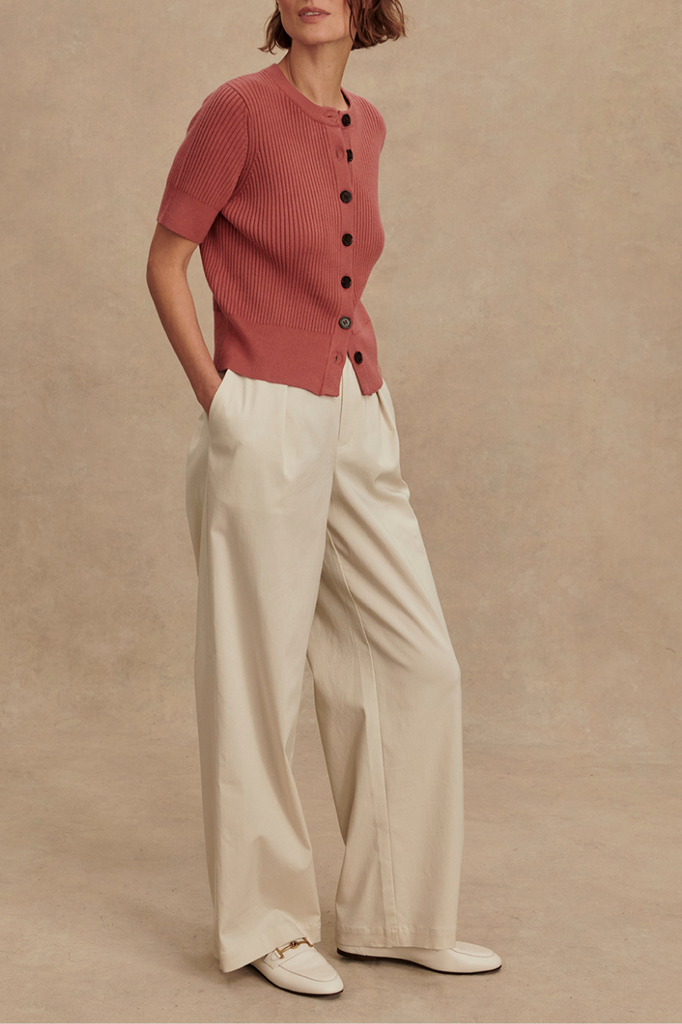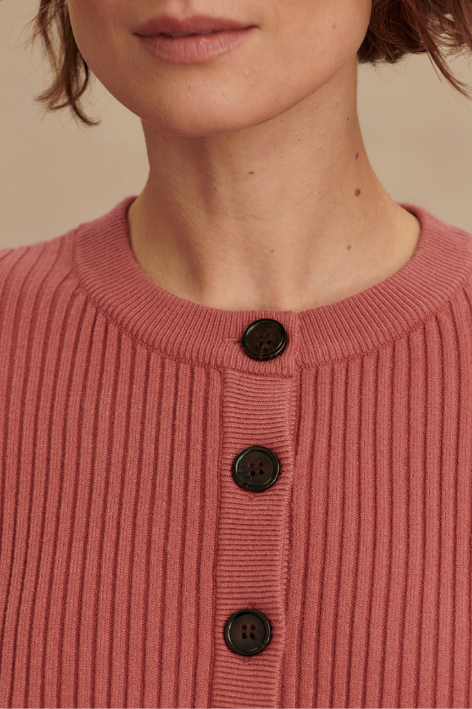 A short sleeve button up cardigan from Varley that features a super soft touch, chunky buttons, and ribbed knitting.
