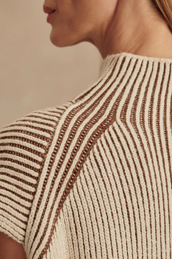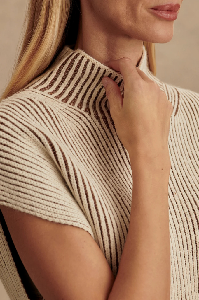 A dressy cap-sleeved sweater with a mock neck detail, dropped arm holes, and a luxurious Alpaca-blend fabric...this Varley top is chic, stylish, and head turning. You're going to love it! Pair with matching Dionne Plated Beanie and Deville Plated Scarf.