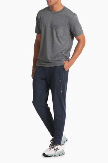 A men's jogger by Vuori featuring a drawstring cord waist, a front thigh zip pocket, and super soft stretchy fabric.
