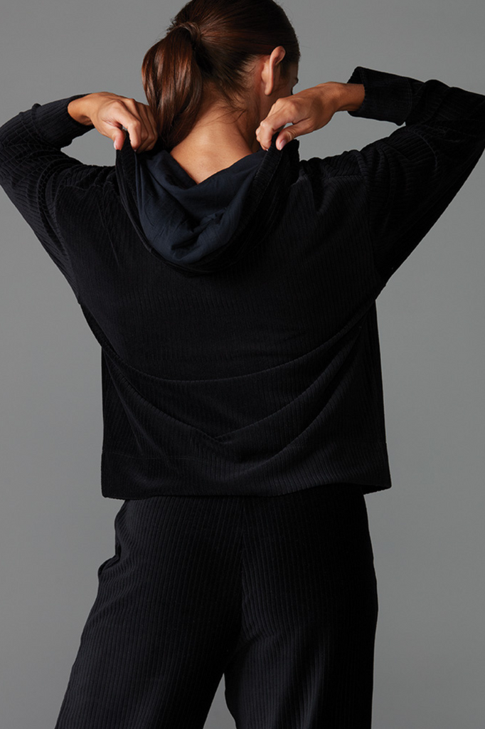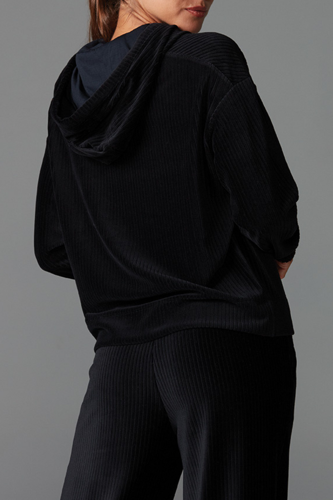 A velvety-feel ribbed pullover from Tavi Noir that features a relaxed fit, hood, wide hem, and cozy fabric. Pair it with Tavi's Wide Leg Brushed Rib Pant for a matching set!
