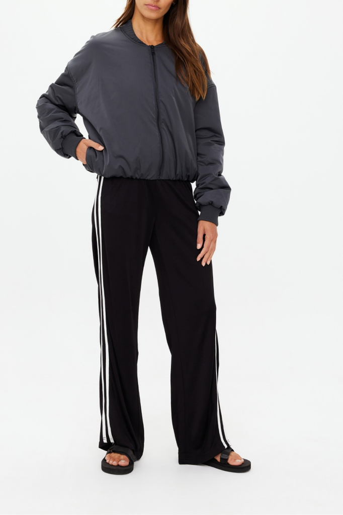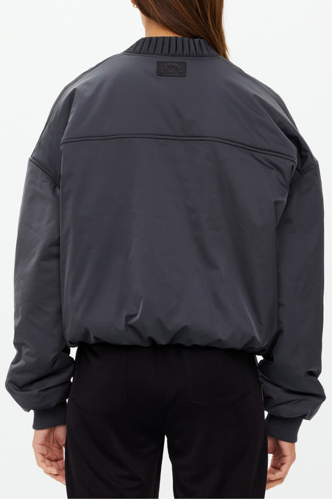 A cropped bomber jacket by The Upside featuring a full front zip front, elastic hem, ribbed cuffs, and a foldable collar.