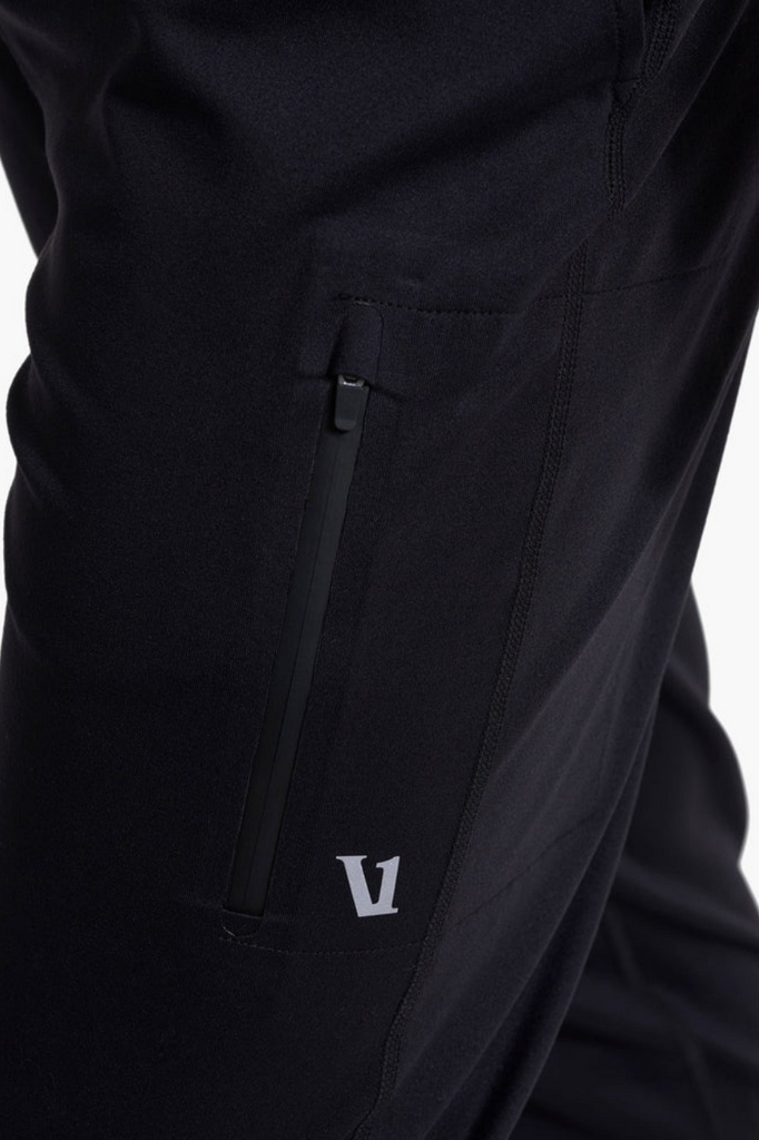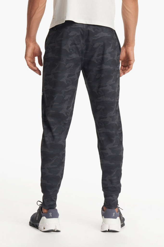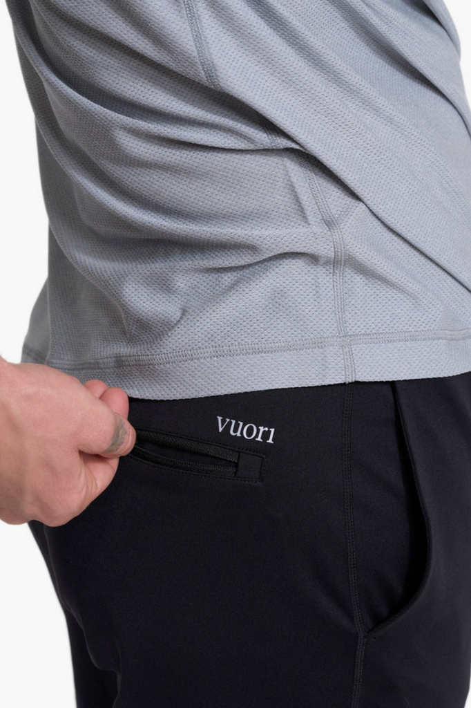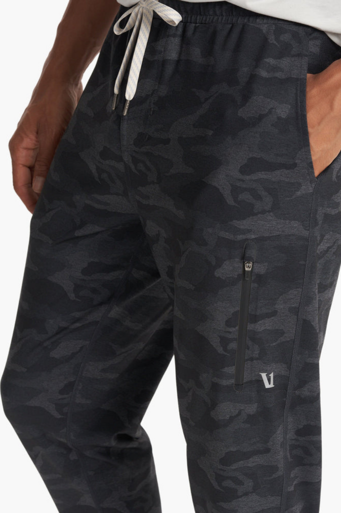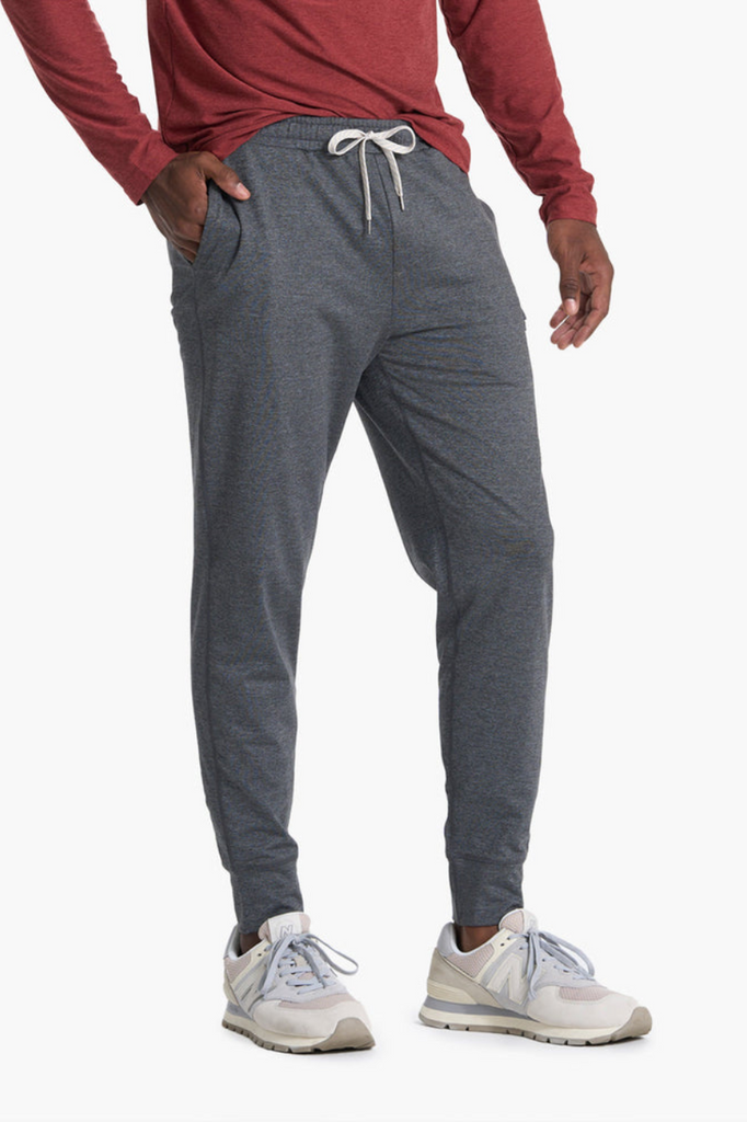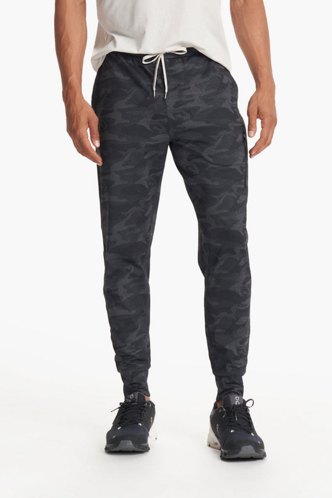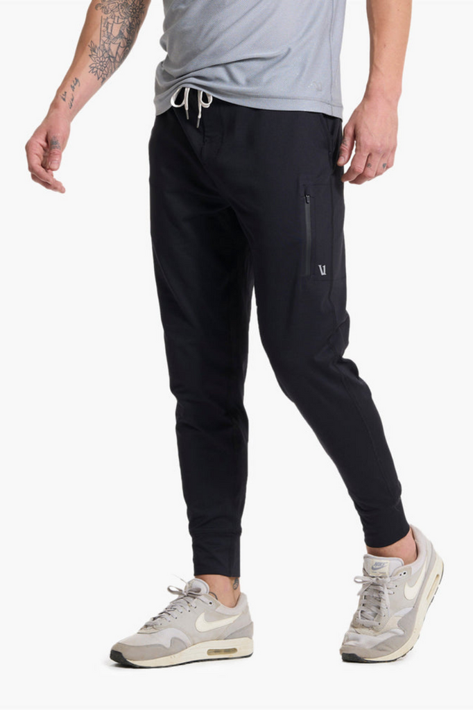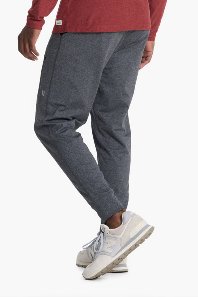 A men's jogger by Vuori featuring a drawstring cord waist, a front thigh zip pocket, and super soft stretchy fabric.