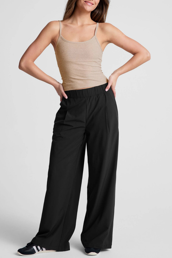 A mid rise, pocketed, elastic waistband pant by Beyond Yoga that will take you from the office, to errands, and more! Suitable for travel? We give it a thumbs up! We love the relaxed fit leg and flattering silhouette.