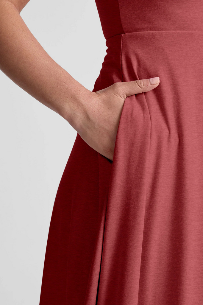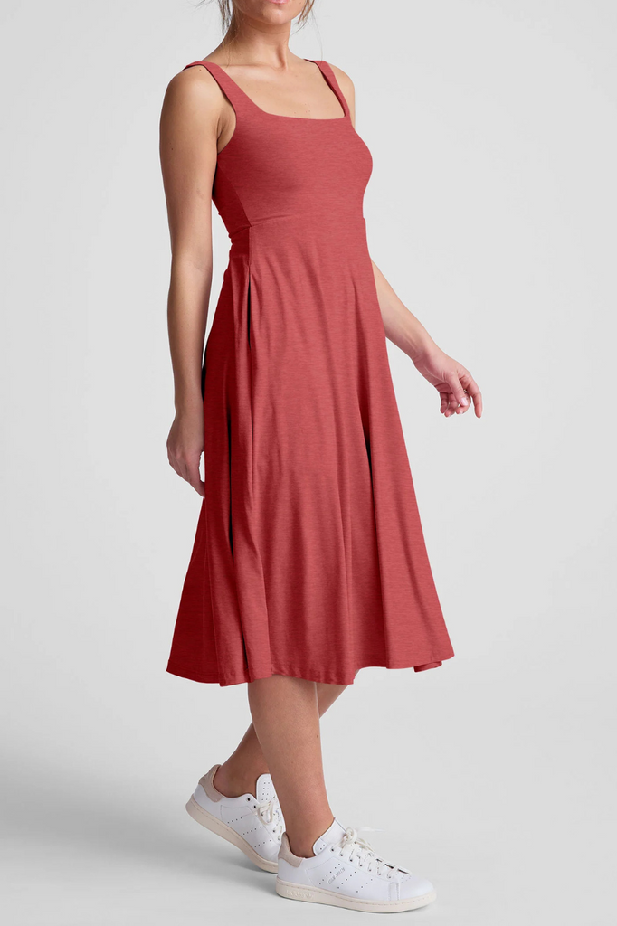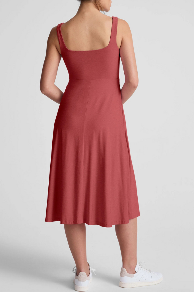 A casual shift dress by Beyond Yoga featuring a square neckline, thick straps, and pockets!! Dress up or down. Midi length.