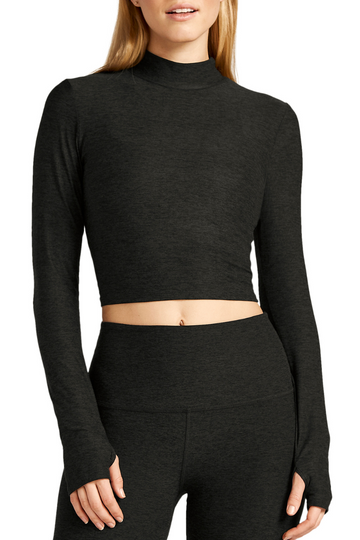 This top is made from a lighter version of Beyond Yoga's Spacedye fabric--aka, butter. It features long sleeves, a slimmer fit, a high neck, and a crop length.
