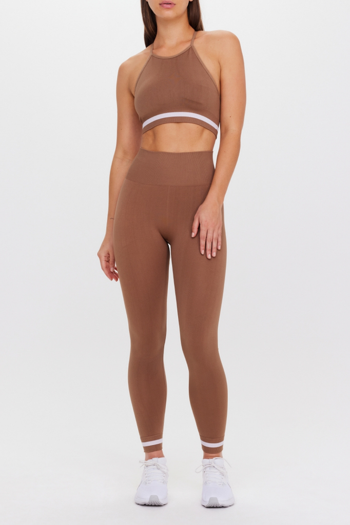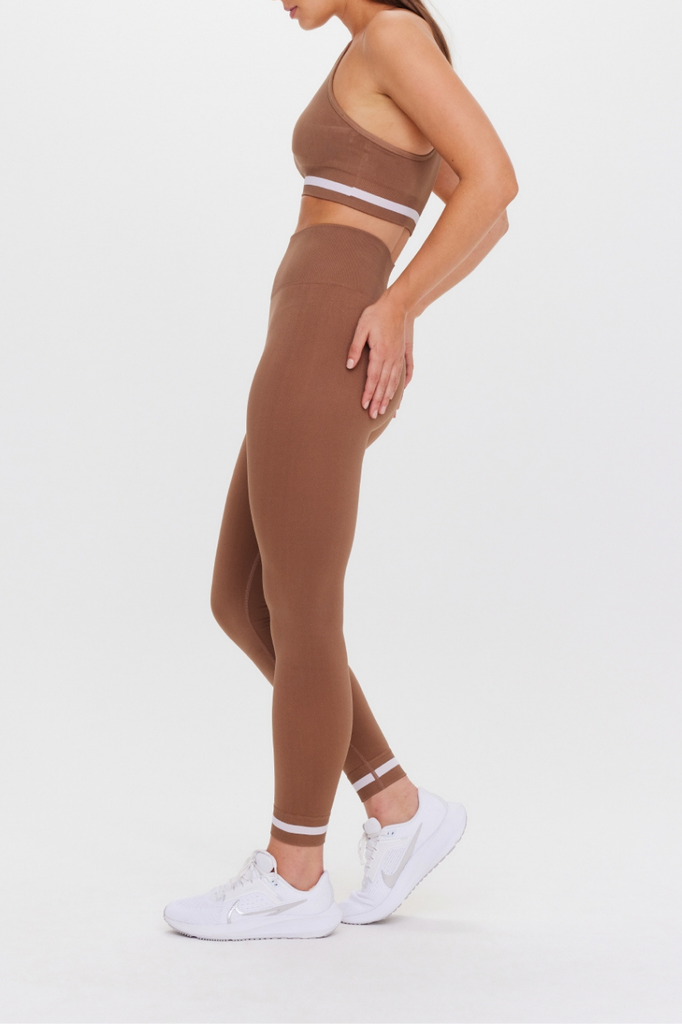 High-waisted 7/8 leggings by The Upside with contrasting stripes down the seam - giving you a sleek seamless look. Soft-ribbing at the cuffs and waistband. Pair with The Upside's matching top: Form Seamless Angie Crop.