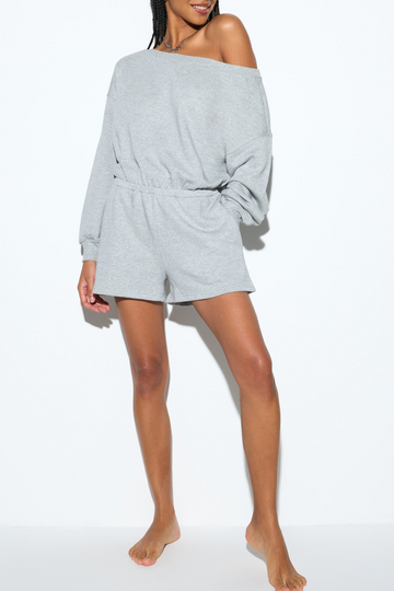 An off the shoulder romper by Spiritual Gangster that we know you will love! Featuring an open neck, comfy cozy fabric, and an elasticized waistband.
