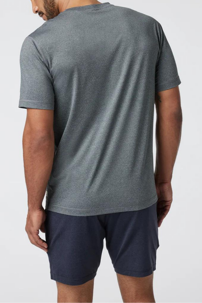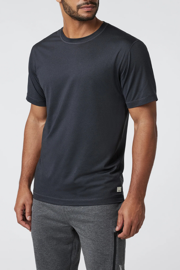 A moisture-wicking men's t-shirt by Vuori featuring a crewneck look and perforated design.