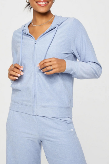 This buttery soft zip up hoodie by Fabletics features a drawstring hood, side slit pockets, and a full zip front. Pair with the Cloud Jersey Wide Leg Pant for a matching set!